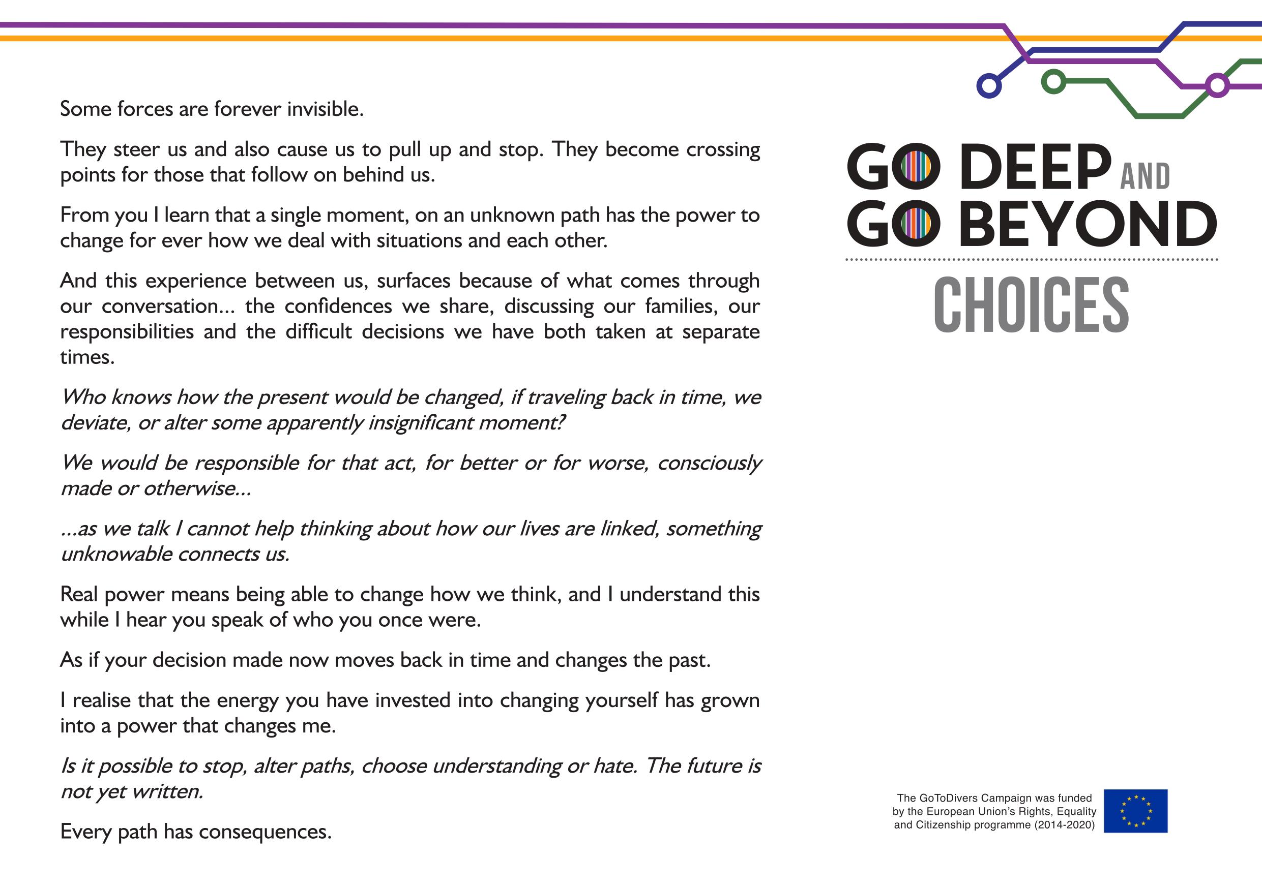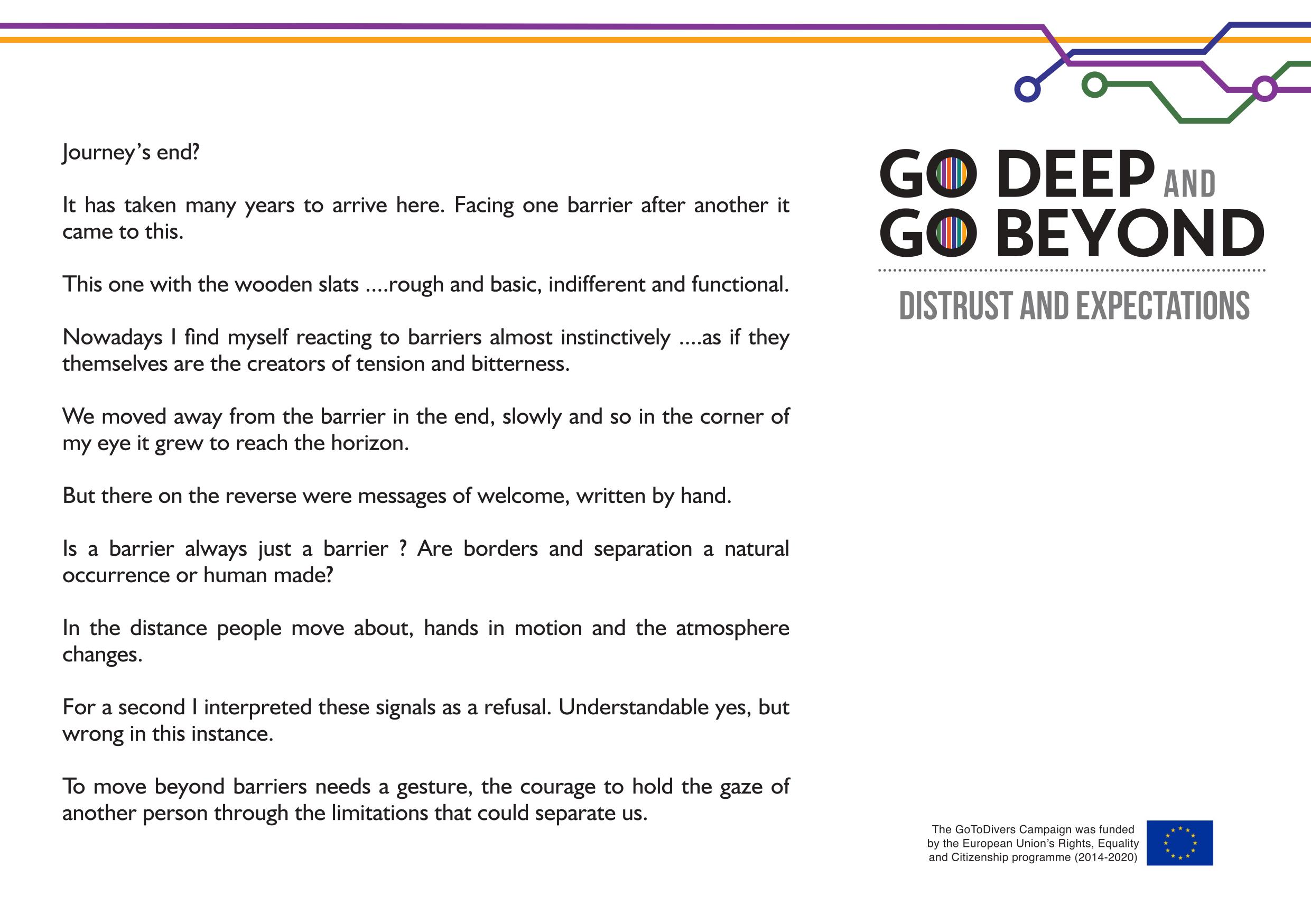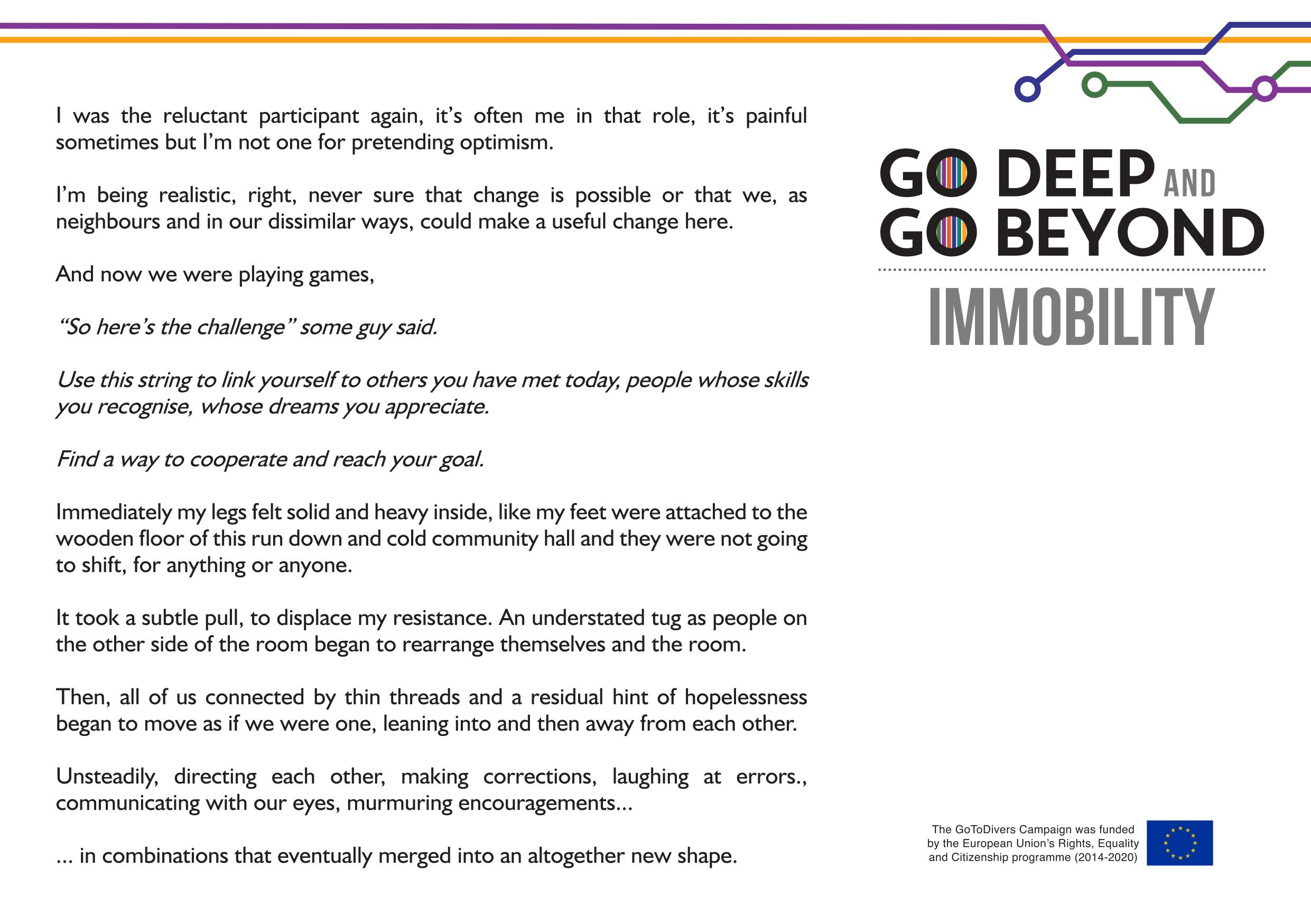 The four Go Deep games exhibited are supported by the EU’s Rights, Equality and Citizenship programme (2014-2020) under the project Go Deep Together in Diversity. In these four games over 100 people directly participated as “players”, while well over 500 community-members were also involved, helping to set up 10 collaborative community-events and urban interventions to change the shape of the neighbourhood.