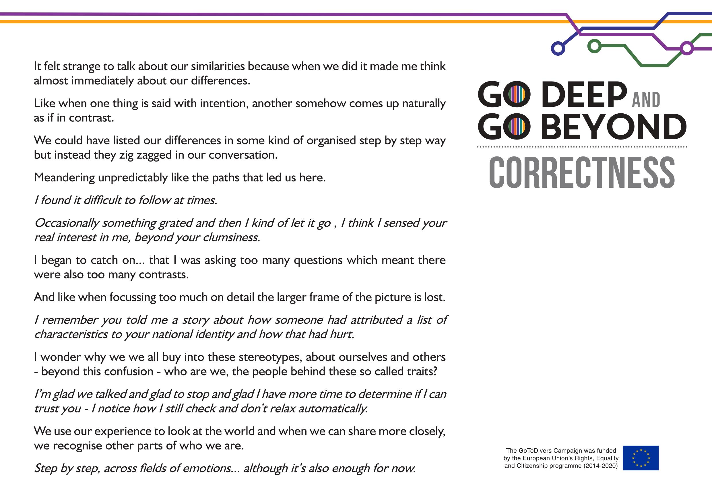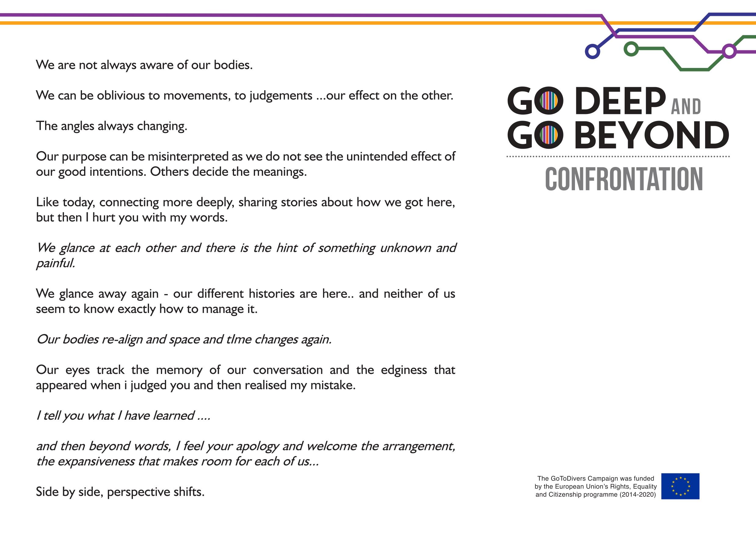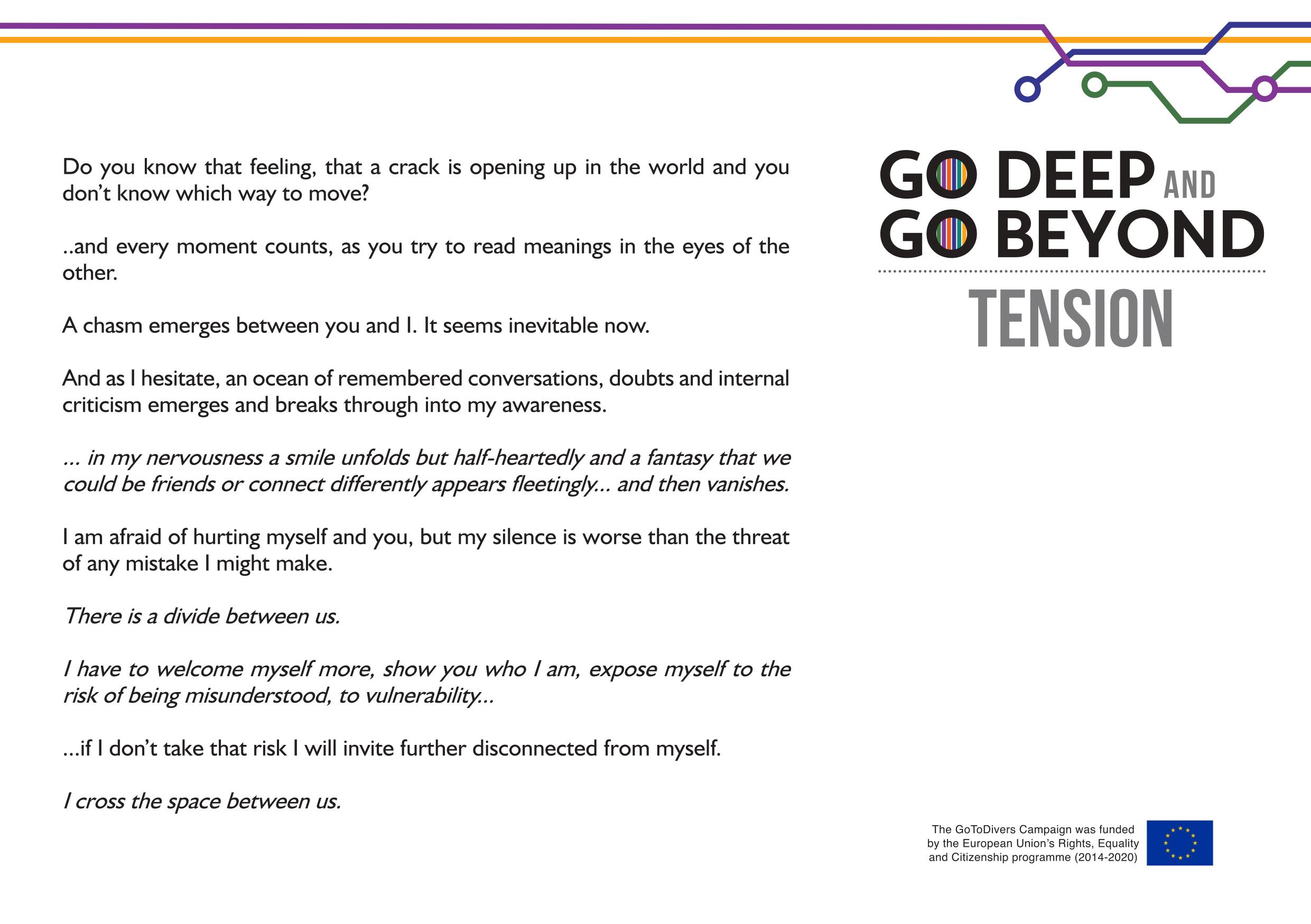 The four Go Deep events that informed this exhibition had the goal of going beyond the surface themes of diversity to focus on relationships and contact. The exhibition profiles how relationships are built from increasing the awareness we have in seemingly small moments of contact. It shows that within ordinary interactions our unconscious assumptions or how we should behave, affect our capacity to include deeper parts of ourselves and the other. Personal interaction provides the basis for wide scale change. This takes dedicated contact and awareness of how tiny changes can build up to eventually transform communities. Through this learning we have uncovered a process that can be used in different types and shapes of community: To help citizens and community members discover and create their own paths toward inclusion.