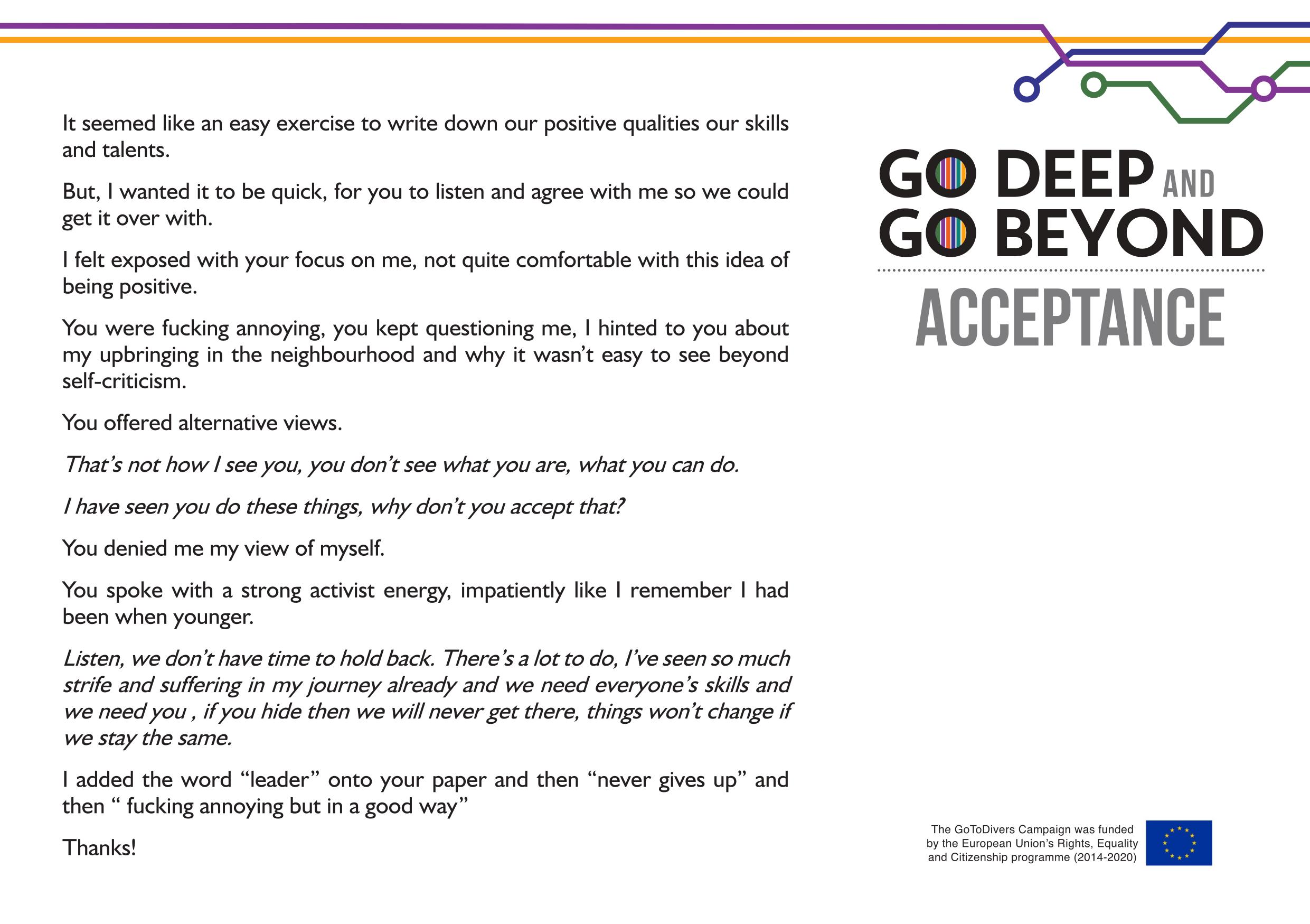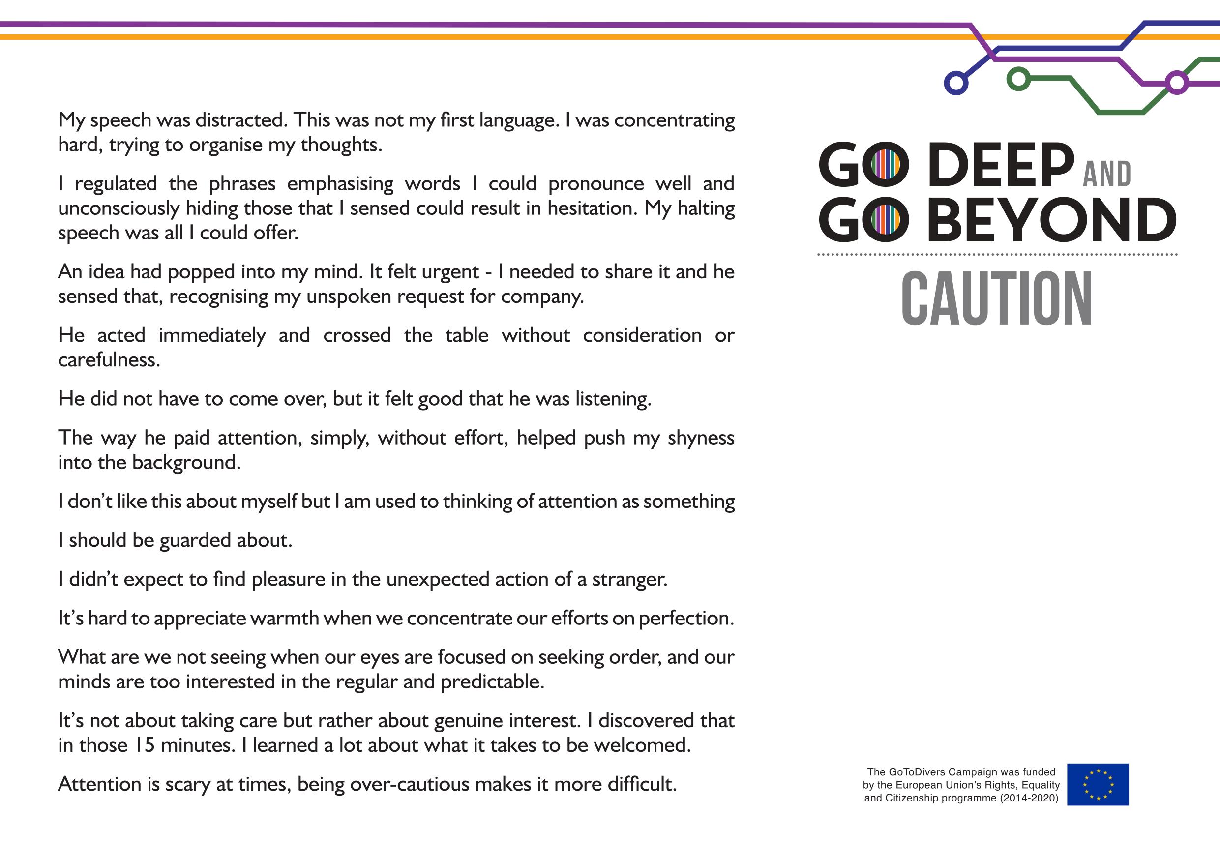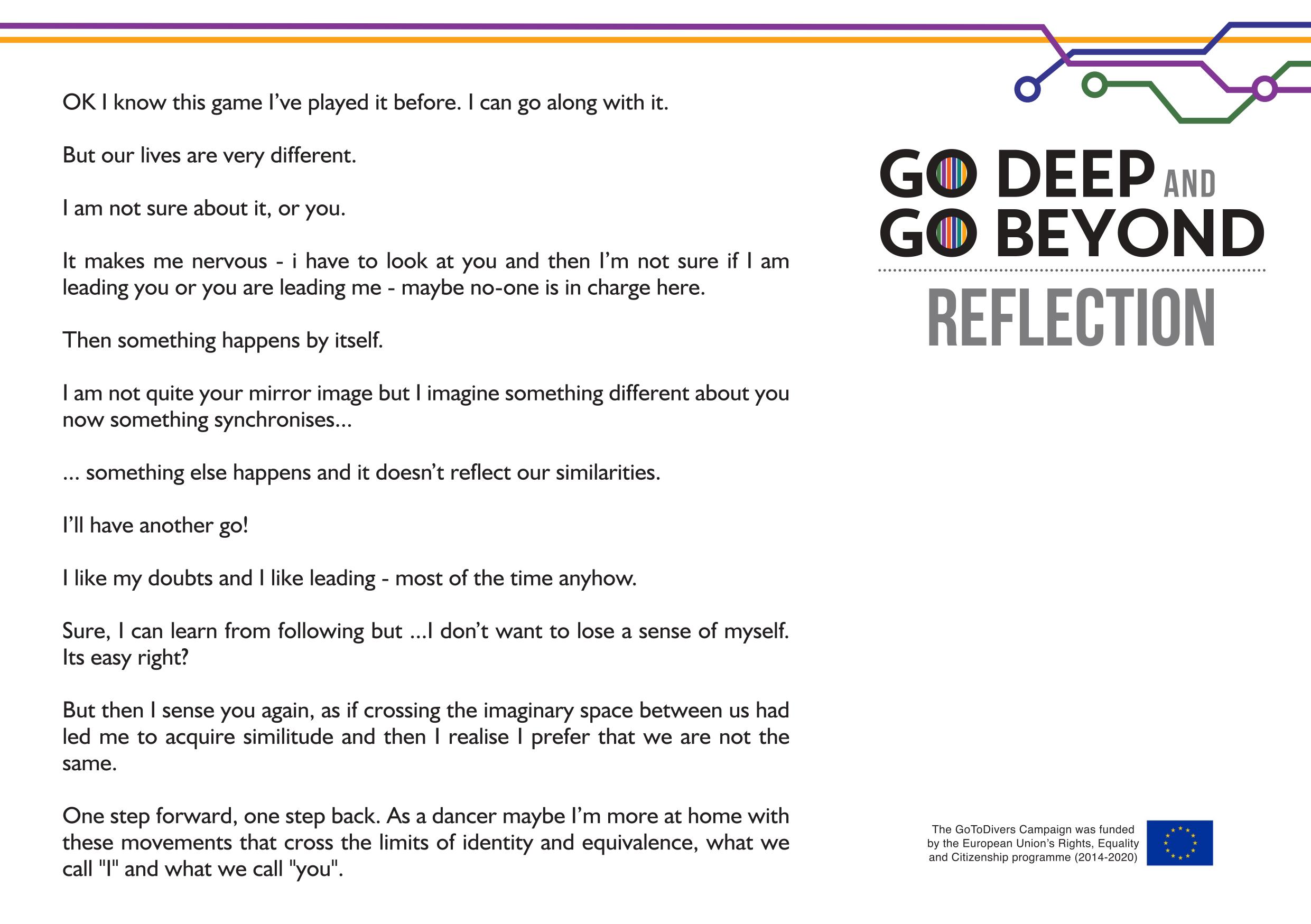 The four Go Deep events that informed this exhibition had the goal of going beyond the surface themes of diversity to focus on relationships and contact. The exhibition profiles how relationships are built from increasing the awareness we have in seemingly small moments of contact. It shows that within ordinary interactions our unconscious assumptions or how we should behave, affect our capacity to include deeper parts of ourselves and the other. Personal interaction provides the basis for wide scale change. This takes dedicated contact and awareness of how tiny changes can build up to eventually transform communities. Through this learning we have uncovered a process that can be used in different types and shapes of community: To help citizens and community members discover and create their own paths toward inclusion.